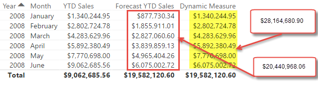 Well all of that is great, but that still doesn’t explain why the Forecast YTD Sales has the same value as our Dynamic Measure at the total row. The Dynamic Measure calculation always takes YTD Sales unless there are no sales on the last day of the current month in which case it will take the Forecast YTD Sales. This was explained in the webinar so please revisit that if you don’t remember the why behind this calculation.