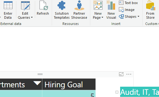 I would recommend storing this list of values in a file or in a table in a database, for this example I will quickly put these values into a table in my PBIX file. Navigate to the home ribbon and select “Enter Data”, I will name the column Departments and the table Slicer, next I will add the five distinct departments as records for the departments’ column (IT, HR, Tax, FIN, Audit).