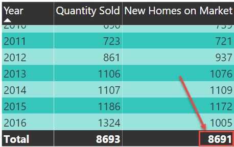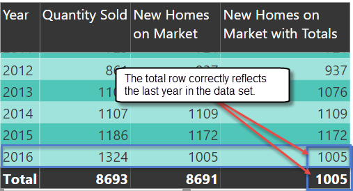 In this example, the total row is returning all homes listed for all years in the filter context, this is in fact the sum of all the rows in the column. However, you may expect to only see the homes newly listed on the market for the latest time period, in this case that would be how many homes were listed in 2016. The result of 8,691 homes listed in the total row is not wrong or incorrect, it depends on what you are specifically looking for, it could definitely be unexpected depending on your analytical needs. If you do not wish to see the total of all homes ever listed in the current filter context then you have a couple of options available to you.