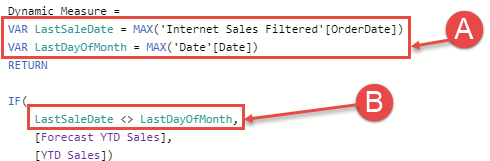 • If the two variables don’t match, then it is the current month and [Forecast YTD Sales] is returned.