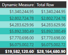 In the above screenshot, the total row for the dynamic measure is displaying $19,582,120 but the sum of all the rows is actually $28,164,680. Let’s take a look at the dynamic measure and figure out why the total row is not what we might expect.