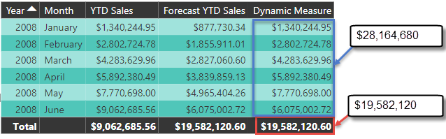 In the following table there are three measures, the first measure is YTD Sales and it tracks the actual sales. The second measure is Forecast YTD Sales and this is the forecasted sales. The third measure is the Dynamic Measure, this is the proposed measure designed to replace the other two measures. However, the total row produces unexpected results, and therefore is perfect for this blog post: