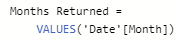 Remember step 2 from above? We want to execute our dynamic measure against each row in the table, the VALUES function will get us the distinct list of the months. Let’s take a look at the VALUES function in action. I have created a table using the following formula to display the results: