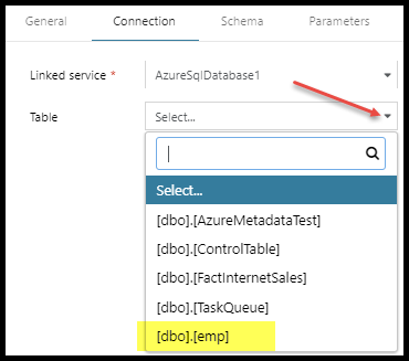 Once the linked service account has been created I will select the table I want to load. All available tables will show up in the drop down list. I will select my dbo.emp table from the drop down.