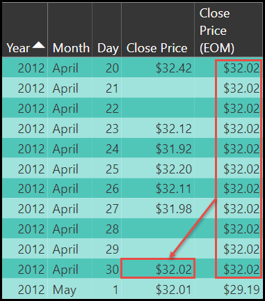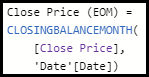 - First, the close price and the close price (eom) measure have identical values, this means our closing month measure is displaying the closing price for each individual day. That tricky filter context got us again!