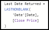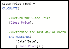 We need to write a measure in DAX that is going to determine the last date of the month where the stock market was open. We are going to solve this problem by using the function LASTNONBLANK. This is an extremely useful and helpful function.