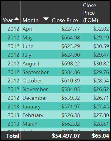 Next, I will add this new measure to our table for validation. Everything looks perfect! The measure is not blindly returning the last day of the month, it’s returning the last day of the month that had a closing price for the stock, meaning the value returned for June, September, and March is exactly what we need.