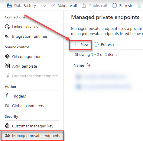 To create a managed private endpoint in Azure Data Factory and Synapse, go to your Manage hub, then click on Managed private endpoints, then click New. Keep in mind, this will be disabled and not available until after you have created the Integration Runtime with the managed virtual network.