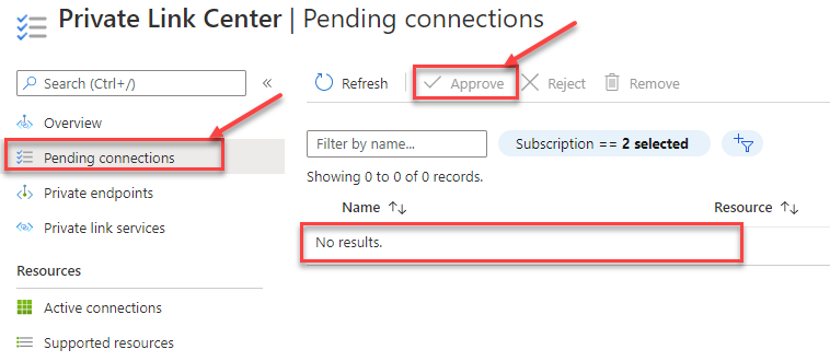 Once in the Private Link Center go to Pending Connections, from here, you can approve, reject or remove any connections that may be pending. In my screenshot I don’t have any pending connections because I approved them in the video!
