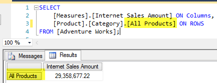 The following MDX Query returns the [All Products] member from the attribute hierarchy “Category”.