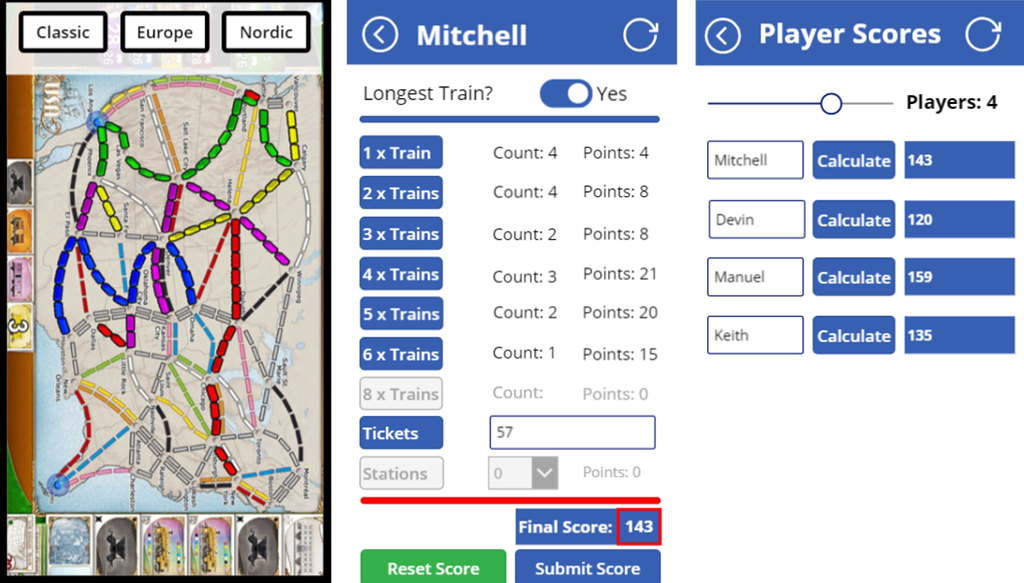 Here is the animated GIF of the Ticket to Ride scoring app I created using PowerApps: