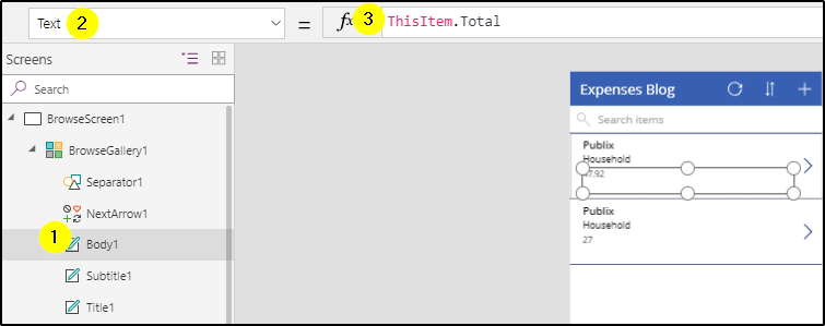 • Select the control currently displaying the expense amount. Once again, you can select this control directly from the app or select the control from the Left Navigation bar.