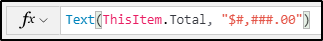 The formula is Text(ThisItem.Total, “$#,###.00”), see image below: