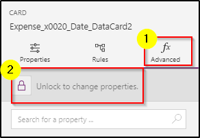• Next, navigate to the properties window found on the right side of the screen and select Advanced, in the advanced properties click Unlock to change properties. This will now unlock the card so that we can edit the controls.