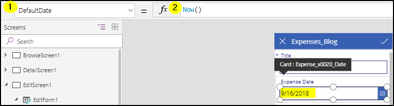 • Finally, update the formula for DefaultDate to simply Now(). As you can see in the screenshot below, the date of the date picker control will now default to the current date whenever a new record is being added in the app!
