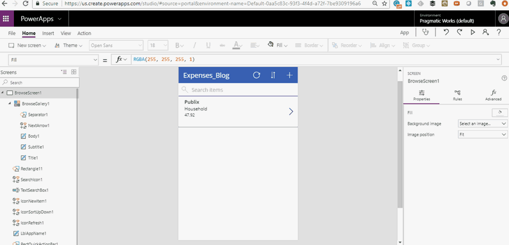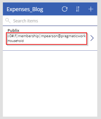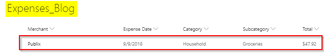 In the below image you can see I have created a SharePoint list called Expense_Blog and I have added five columns. I then populated the list with a single row of data so I would have some sample data to preview my app with. I prefer to always start with sample data as I have found this makes building and customizing the app easier.