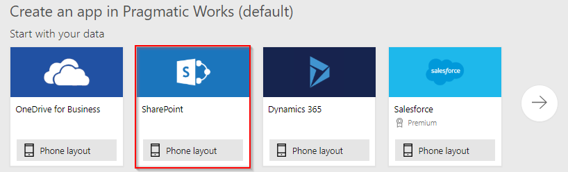 Clicking Make this app will launch create.powerapps.com. Once launched you will be asked to connect to your data. Select SharePoint.