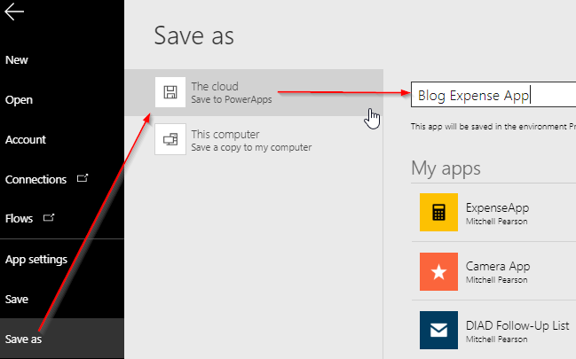 The last step is to save the app. Click File –> Save as –> The Cloud –> Blog Expense App –> Save!