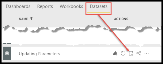 To update parameters, navigate to the Datasets section in the Power BI Service. Next, click on the schedule refresh icon. Updating parameters is done from the schedule refresh window.