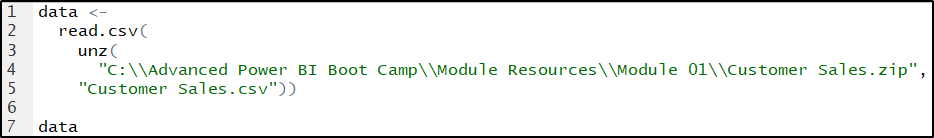 - On line two we are using read.csv to extract the results from the csv file, Customer Sales, and these results are stored in the variable from step one, please note that this process can not occur until after the file has been unzipped.